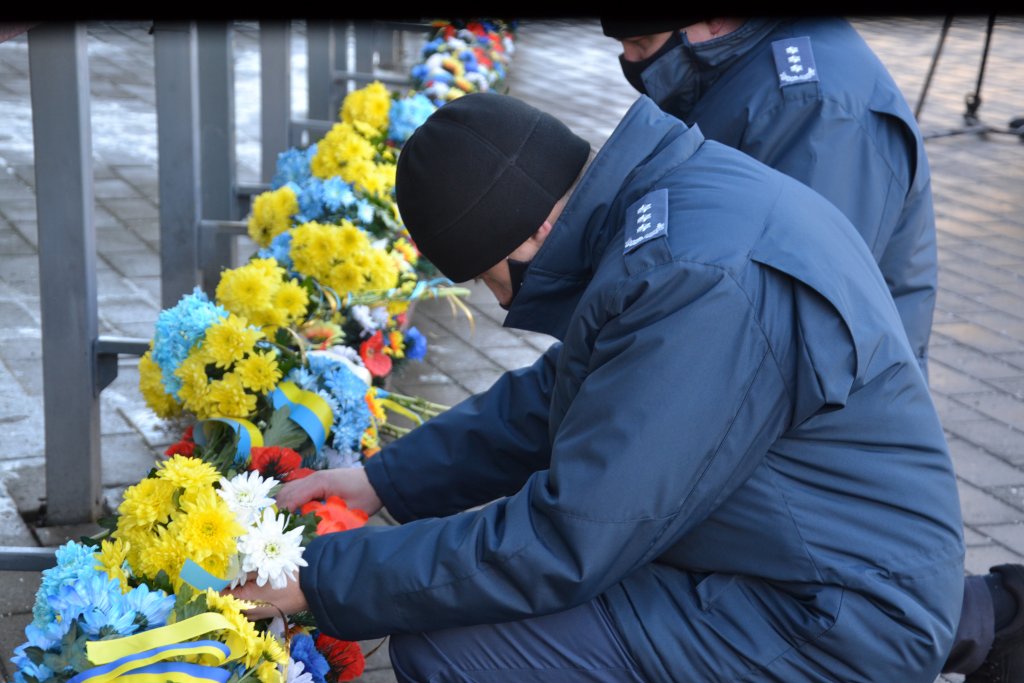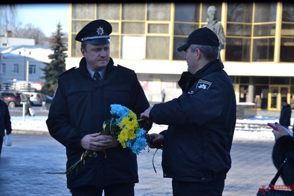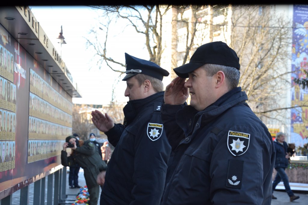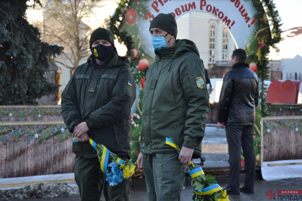 У Луцьку на Театральному майдані з нагоди Дня Соборності зібралися представники влади, поліції та Нацгвардії , які поклали квіти до пам’ятного фотостенду «Герої Небесної Сотні – Загинули за єдність України».