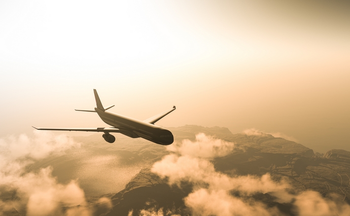 Airplane flying over the city and the beach sunrise 3d rendering lens flare affect