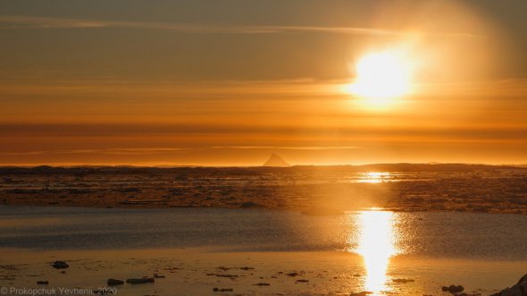 На фото, далеко в променях сонця видно айсберг, який нагадує піраміду. Знімки опубліковані на сторінці Національного антарктичного наукового центру в Facebook.