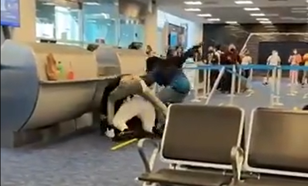 Потім вони почали бійку з іншими трьома мандрівниками, які в той момент теж були біля стійки виходу на посадку. На кадрах, знятих очевидцем, видно, як дві окремі групи людей наносять один одному удари кулаками й б’ють повалених на підлогу ногами.