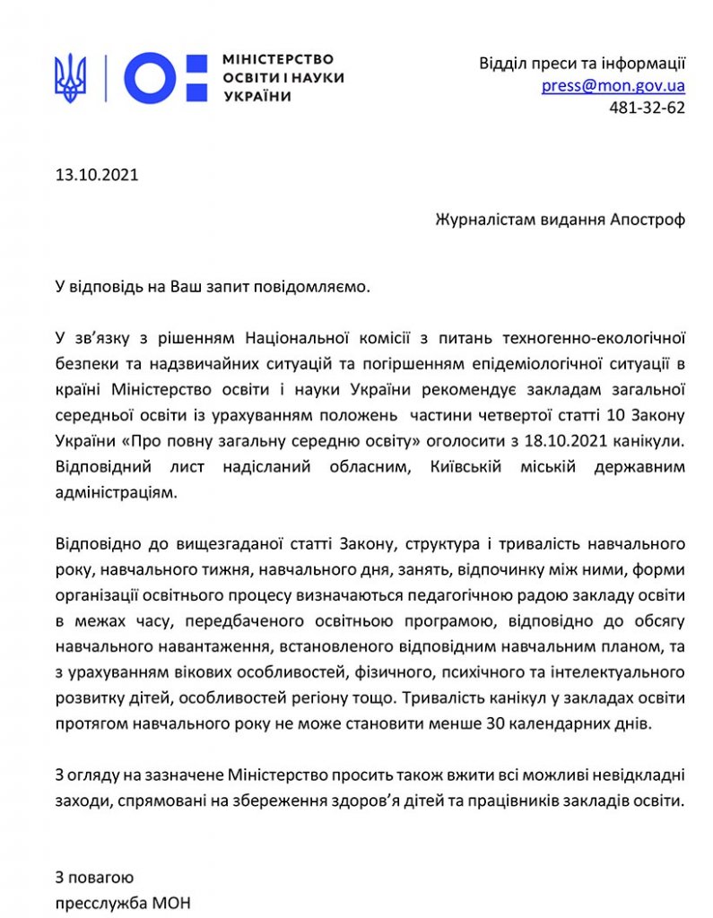 «Міністерство освіти і науки України рекомендує установам загальної середньої освіти оголосити з 18.10.2021 канікули. Відповідний лист було відправлено обласним, Київській міській державним адміністраціям», – йдеться в тексті відповіді.