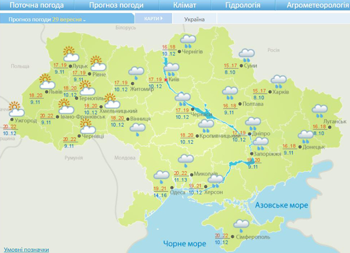 29 вересня часом дощі, вночі у південній та східній частині, вдень у західних областях без опадів. Вітер південно-західний, західний, 5-10 м/с”.