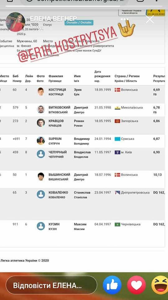 «Ерік Костриця – найшвидший в Україні! 6.68с – з таким результатом Ерік фінішував сьогодні у Сумах на дорослому Чемпіонаті України! Друзі, це фантастично», – ідеться у дописі.