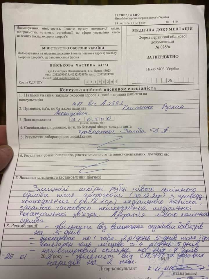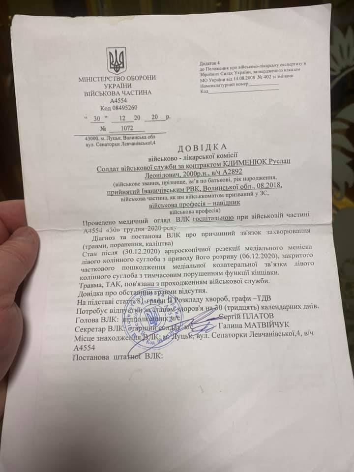 «Сьогоднішній мій вечір зробив дзвінок у двері… Зайшов він, оцей на перший погляд – хлопчина, але насправді – Воїн української армії, який не в запасі, а на контрактній службі, на яку зголосився ДОБРОВІЛЬНО! Це Руслан Клименюк родом із Володимира Волинського. А постукав він не тільки в нашу домівку, а ходить від дверей до дверей і просить про допомогу, збирає гроші, адже потрібна операція і заміна колінного суглоба, а грошей у нього нема… – пише Михайло Імберовський. – Суглоб пошкодив під час виконання службових обов’язків. Це ж в якій державі ми живемо? В голові не вкладається, як це можливо… Шок!!!..».