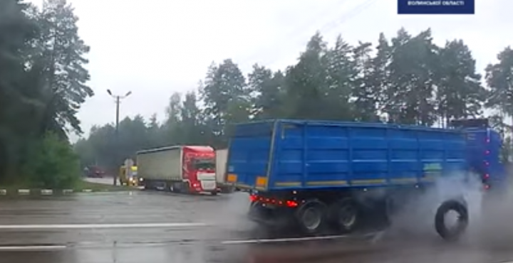 Інцидент стався у вівторок, 24 серпня, близько опівдня, поруч зі стаціонарним постом патрульних «Маневичі» на автодорозі М 07 Київ – Ковель – Ягодин: у вантажівки «вистрілило» одне з коліс з правого боку напівпричепа.