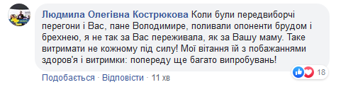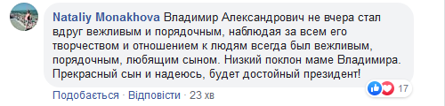 “Спасибі Вашій мамі, що виховала такого чудового сина!!! Міцного здоров’я, щастя, сил і терпіння Риммі Володимирівні!!! Низький уклін Вашим батькам!!!”, “Владимир Александрович не вчера стал вдруг вежливым и порядочным, наблюдая за всем его творчеством и отношением к людям всегда был вежливым, порядочным, любящим сыном. Низкий поклон маме Владимира. Прекрасный сын и надеюсь, будет достойный президент!”, – в такому дусі коментують користувачі.