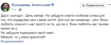 “Друзі, сьогодні – День матері. Не забудьте знайти особливі слова для тих, хто подарував нам з вами життя. Для них ми назавжди – діти. Вони люблять кожного з нас просто за те, що ми є.Вони люблять нас такими, якими ми є. Не забудьте подякувати своїй мамі.Мамуля, ти у мене красотка!!!”, – написав Зеленський.