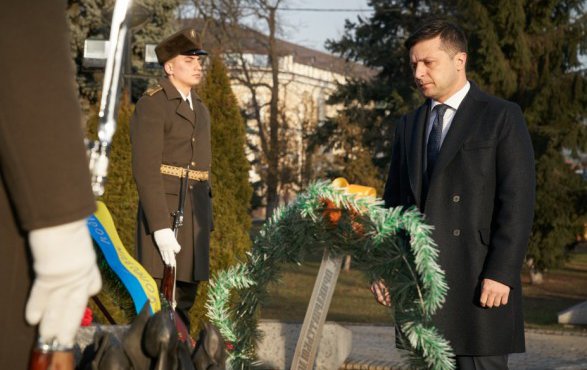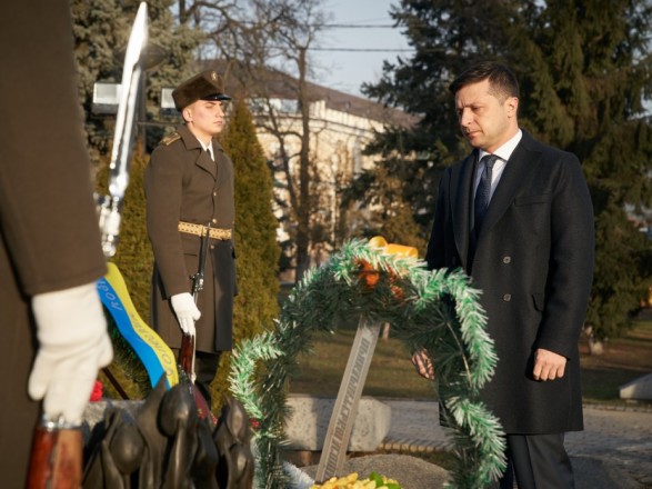 Разом з воїнами почесної варти Володимир Зеленський поклав квіти до скульптури в меморіалі.